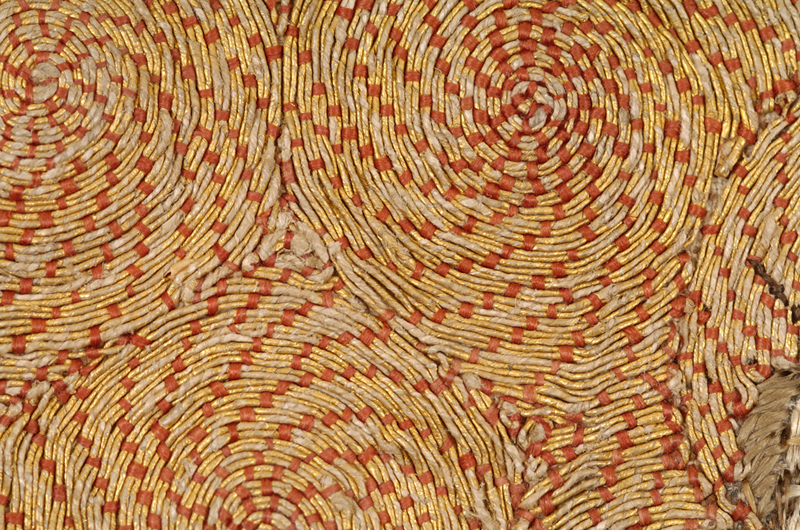 This background *, is made with couched gold filé (joining two threads at a time) in the shape of vortices or fans and is characteristic of the German embroidery of the middle of the XVth century.