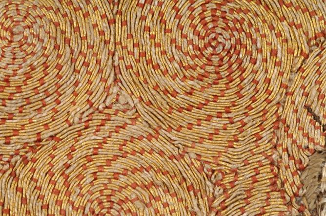 On voit courir des gros fils verticaux recouverts par les filés or en deux brins horizontaux avec les quatre points de soie alternés pour chaque rangée.