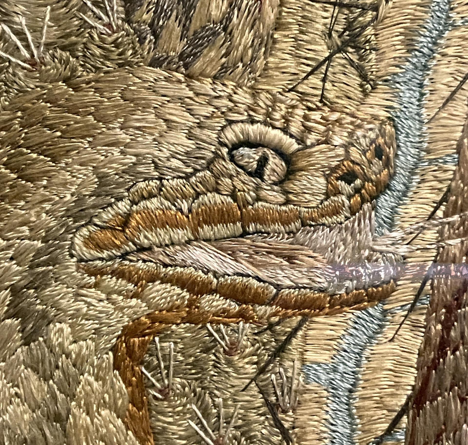 Regardons le visage de la femme, fig. 2. On remarque immédiatement le choix de la soie pour les carnations et du métal (argent) pour la coiffure, et plongeons nous dans un détail des yeux, fig. 3. Les chairs sont exécutées au point fendu, posés de sorte à suivre les rondeurs et le sens des traits, en modifiant les nuances pour traduire le clair-obscur et en accentuant le changement de direction des points pour, par exemple, signaler l’arête, le bout et l’aile du nez. Cette technique, qui joue avec la direction et la longueur du point pour traduire, grâce au jeu de la lumière[2], la brillance et l’opacité, est particulièrement achevée dans le rendu de l’orbite, les paupières, l’iris et la pupille des yeux. C’est pour ces deux derniers éléments que la maitrise de l’artiste est la plus spectaculaire ! Un seul et minuscule point, d’un blanc immaculé, en haut de la pupille, suffit à donner vie au regard dont, les points lancés des cils et des sourcils, fournissent l’encadrement.