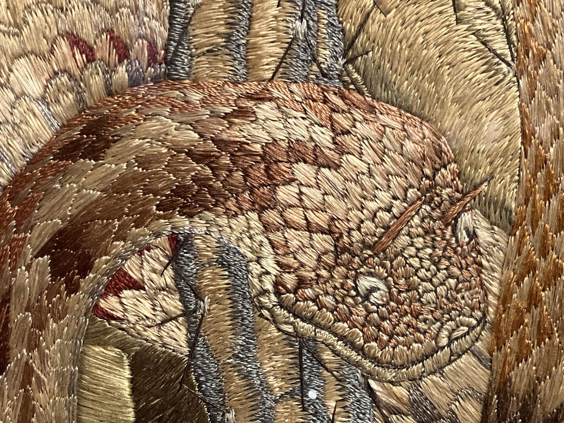 Cette combinaison du travail en couchure et en points piqués est encore plus apparente dans la figure 4 où l’on montre le détail de la partie supérieure du cobra. C’est dans la représentation des écailles du serpent, ventrales et dorsales, que l’adresse de la brodeuse est la plus apparente. Les ventrales sont obtenues par des rangées d’une dizaine de filés parallèles croisés par des fils de soie plus ou moins écartés ; chaque rangée est séparée par des points lancés de soie. Les dorsales sont traitées individuellement, chacune faite d’un filé métal croisé de soie pour obtenir l’arrondi de l’écaille et de la soie pour les individualiser, quand ceci s’avère nécessaire.